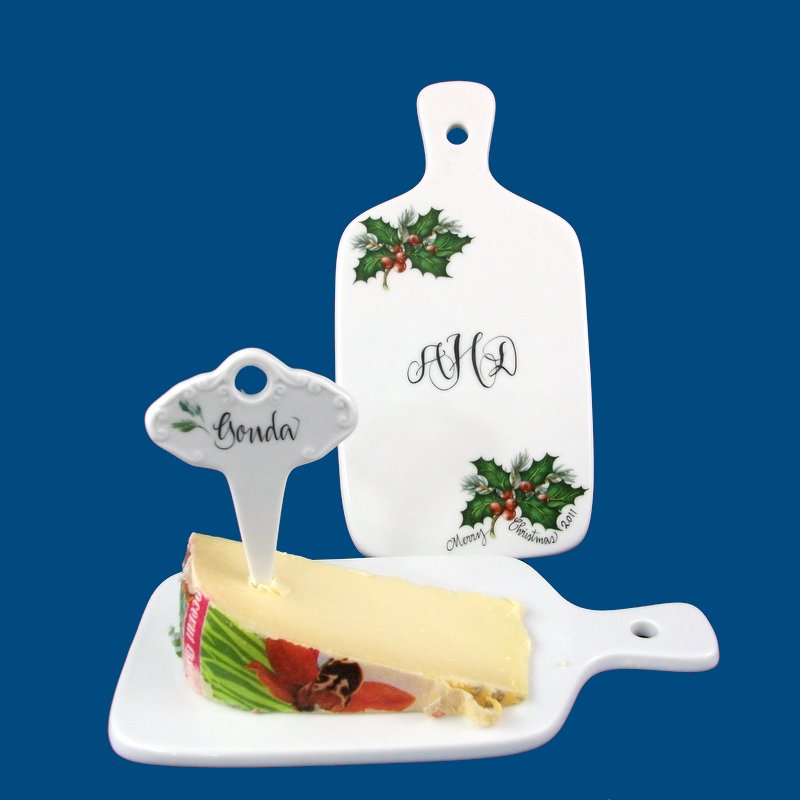 Our porcelain Christmas cheese board and picks make a fabulous gift for the holidays. The cheese board is decorated with festive holly and personalized with individual name(s), monogram initials or a family name. The board comes with one cheese pick personalized with the cheese name of your choice. Additional cheese picks can be ordered. A holiday saying can be hand painted on the front of the cheese tray. A gift box with tulle ribbon and enclosure card is complimentary with your purchase.