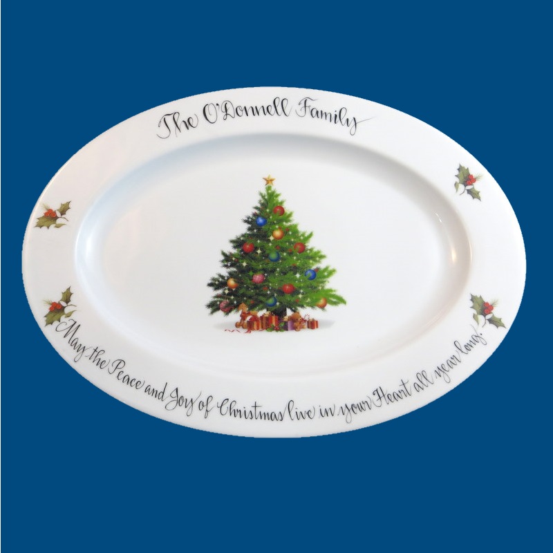 Our hand painted white porcelain Christmas platter features a beautiful Christmas tree design with holly bordering the plate. The family name along with a hand painted personal message can be inscribed on the front of the platter. On the back, Bev writes a short personal message such as, "With love on Christmas, Aunt Betty and Uncle Stu. December 2022.
