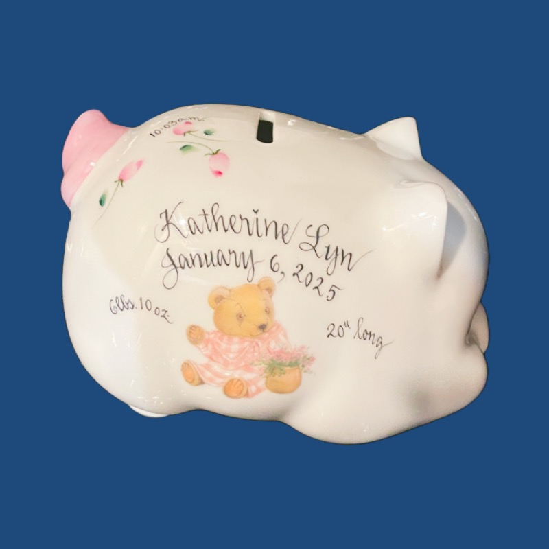 Our classic personalized piggy bank with an adorable pink teddy bear design will be a cherished keepsake. This hand painted white porcelain piggy bank is our most popular baby gift. It is customized with baby's first and middle name, date of birth, weight, time and length. A short personal message can be painted on the bottom of the pig. For example, "Welcome to the world, Love Aunt Jackie, Uncle Michael, Morgan and Melanie. Choose one of our unique designs and we will create a wonderful coin bank that you will be delighted to give. Our personalized piggy bank is the perfect gift for a new baby, birthday or any special occasion. It is complete with a removable rubber plug for easy access. A gift box with tulle ribbon and enclosure card is complimentary with your purchase.