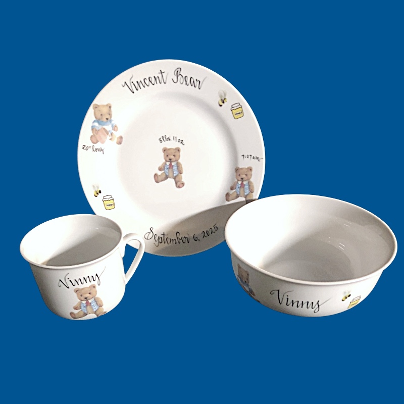 Our hand painted custom monogrammed white porcelain personalized baby dish set is a unique baby gift. Each high quality porcelain dinnerware set comes with three hand painted pieces and includes a 7” plate, a 5 ½ “ bowl , and a 7 oz. cup. You choose the design to customize your dish set. The plate is personalized with the baby’s first and middle name, date of birth, time, weight, and length. The white porcelain bowl and cup are personalized with the child’s first name only. We hand paint a short personal message on the back of the plate. For example, "Welcome to the world. Love, Nancy and Jeff." These personalized baby dishes are a special baby gift for all occasions. A gift box with tulle ribbon and enclosure card is complimentary with your purchase.