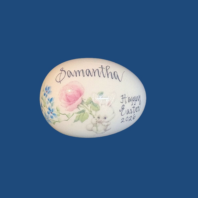 *NEW*Personalized Hand Painted Easter Egg with White Bunny and Rose with Blue Flowers